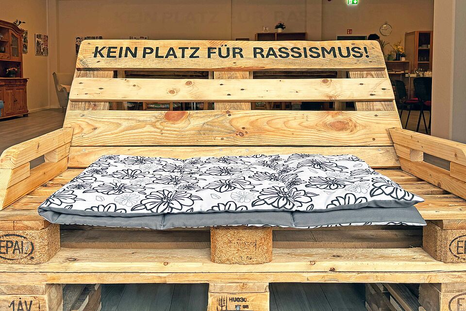 Ein besonderes Highlight und zugleich starkes Symbol war eine aus Holz gefertigte Bank mit der Aufschrift „Kein Platz für Rassismus“. Gebaut wurde sie von Männern aus der DRK-Unterkunft Neuland. Die Bank bot vor Ort auch einen zentralen Treffpunkt für Gespräche und Austausch.
