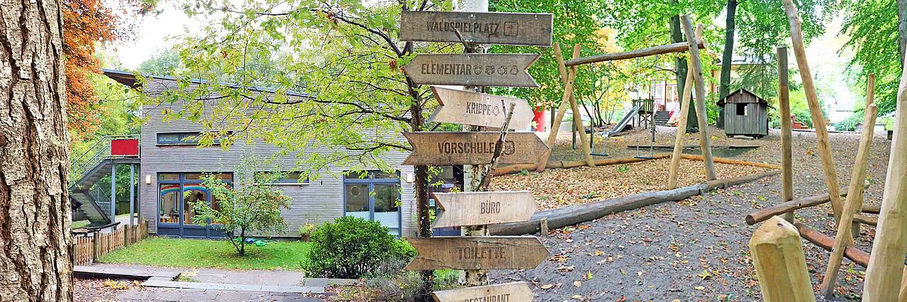 Der Elementarbereich ist in einem älteren, geschichtsträchtigen Gebäude untergebracht, das dem Haus seinen besonderen Charakter verleiht. Im Jahr 2010 wurde die Kita durch einen modernen Neubau erweitert. Hier befinden sich Krippen- und Vorschulbereich sowie ein Kinderrestaurant, in dem alle Kinder mit frisch zubereiteten Mahlzeiten versorgt werden.